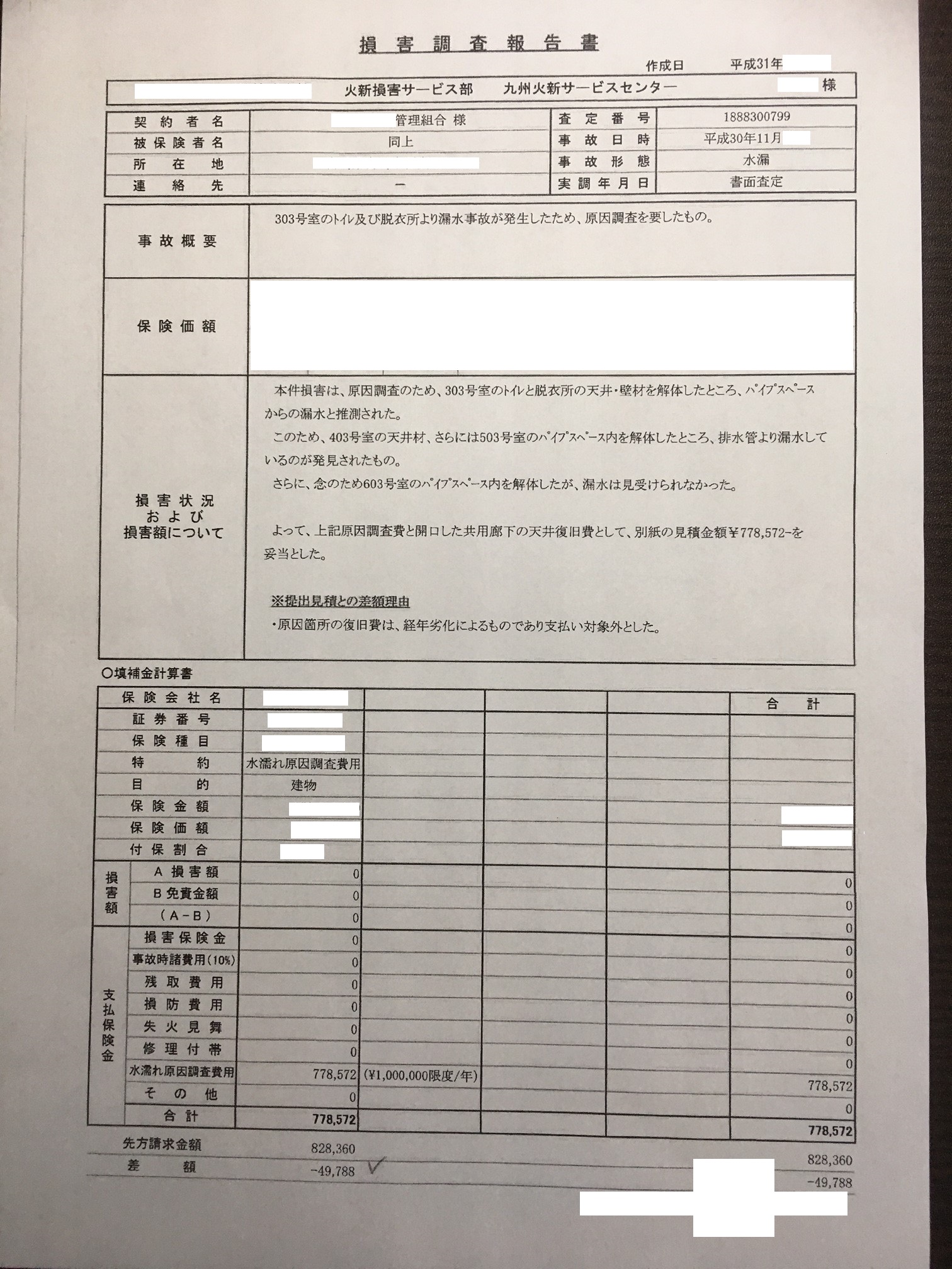 見積もり金額より49,788円のマイナスではありましたが、ほぼ今回の水漏れの原因調査にかかった費用はマンション総合保険の『水濡れ原因調査費用補償特約』から支払われたということになります。